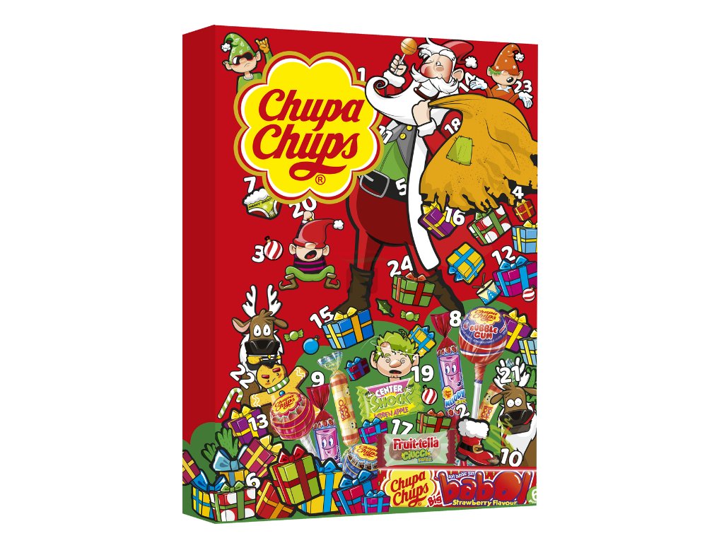 Kalendář obsahuje: 4x Fruittella 6x Center Shocks Žvýkačka 1x Babol Jahoda 5x Look-o-Look Roll 6x Chupa Chups To nejlepší z 1x Chupa Chups Bubblegum Pop 1x Chupa Chups Melody Pop