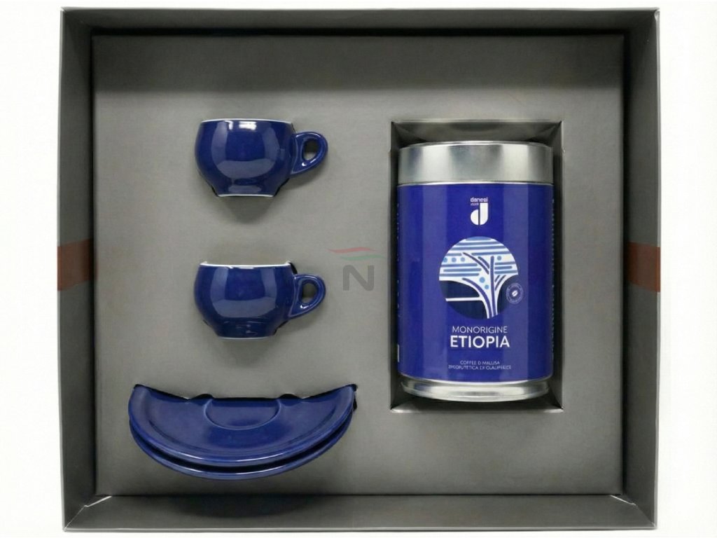 Danesi Duo Plus Set Blue Etiopia Zrno - Darková Kazeta Zrnková Káva 250 g + 2 šálky a 2 podšálky - modrá