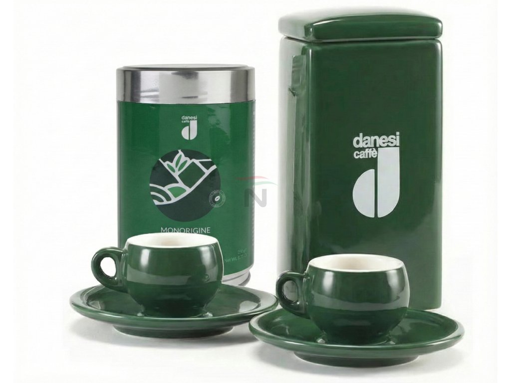 Danesi Duo Plus Set Green Ruanda Mletá - Darková Kazeta Mletá Káva 250 g + 2 šálky a 2 podšálky - zelená