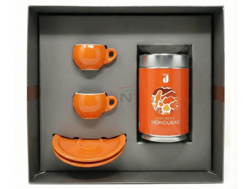 Danesi Duo Plus Set Orange Honduras Zrno - Darková Kazeta Zrnková Káva 250 g + 2 šálky a 2 podšálky - oranžová