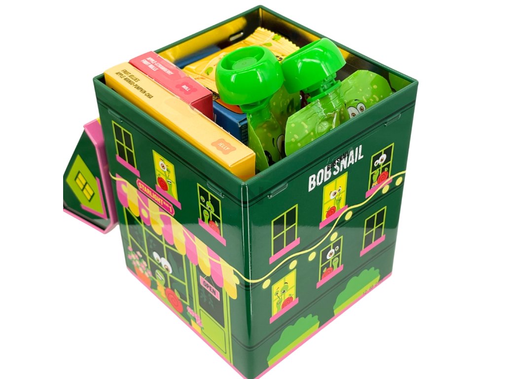 Udělejte radost svým nejmenším s dárkovým boxem Bob Snail, který v sobě skrývá svět plný ovocné chuti a zábavy! Tento jedinečný balíček není jen sbírkou zdravých pochoutek, ale také kreativní hračkou. Každý box je navržen jako barevný domeček, který po vyprázdnění může sloužit jako součást dětského městečka Snail City.
